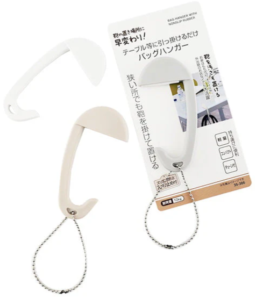 一方、「バッグフック(モノトーン)」は、軽くて持ち運びがしやすく、さっと引っ掛けるだけの手軽さが魅力です。シンプルで落ち着いたモノトーンのデザインも嬉しいです。