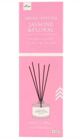 ダイソーで手に入るアロマディフューザーは、気軽に香りを楽しみたい方にぴったり。110円の「ジャスミン&フローラル」は、爽やかさの中に甘さがある万人受けする香りで、玄関や洗面所など小さなスペースに置くのがおすすめです。容量は50mlと少なめですが、その分コンパクトで場所を選ばず使えます。