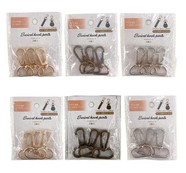 バッグやショルダーストラップ、小物の持ち手に最適で、用途やテープの幅に合わせてサイズを使い分けられます。表面は染色メッキ加工されており、ゴールド・シルバー・アンティークゴールドの3色展開で、作品の質感やデザインに合わせた選択が可能。回転式フック構造なので、テープや紐がねじれにくく使いやすいのも魅力。
