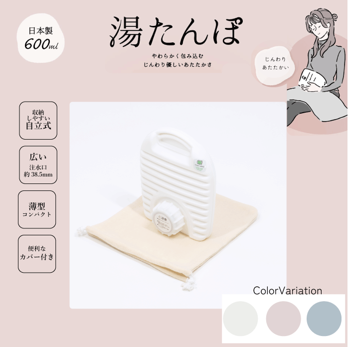 柔らかい素材でできているため、体にフィットしやすく、持ち運びもラクにできます。お湯を入れるだけで簡単に使えるうえ、電源いらずでエコ&節約にも◎。カバーを付けるとさらに保温性がアップし、やけど防止にも役立ちます。カラー展開も可愛らしく、オフィスや車内などでも違和感なく使えるのが魅力です。