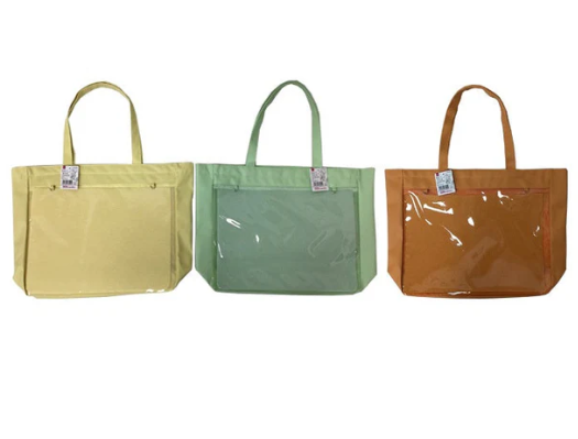 Le pumoのこのクリアバッグの最大の特徴は、大容量かつ汎用性の高さです。サイズは約 横幅40cm×高さ40cm×マチ13cm、持ち手の長さは約54cmで、肩掛けも可能な余裕あるサイズ感で、バッグやトートをそのまま丸ごと入れて、ライブやイベントですぐに痛バッグへと変身できる最高に使えるバッグです。