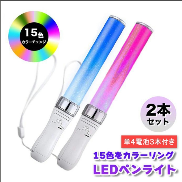 高輝度LEDチップで強力発光のペンライトは、単4乾電池使用タイプでスタミナも抜群です。また、ストラップがついているので、長時間使用しても手が疲れにくく、不意の落下や紛失も防いでくれます。両手で盛り上がれるよう2本セットなのもうれしいポイントですね。LED15色切替×2本セットでこの価格はかなり優秀です。