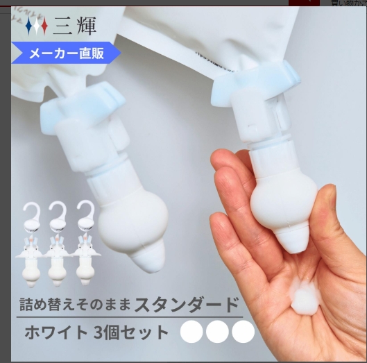 三輝の「詰め替えそのままスタンダード」は、取り付けも簡単で、シャンプーなどの詰め替えパックがそのまま使えます。特徴は、パックを逆さに吊り下げるスタイル。