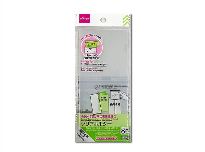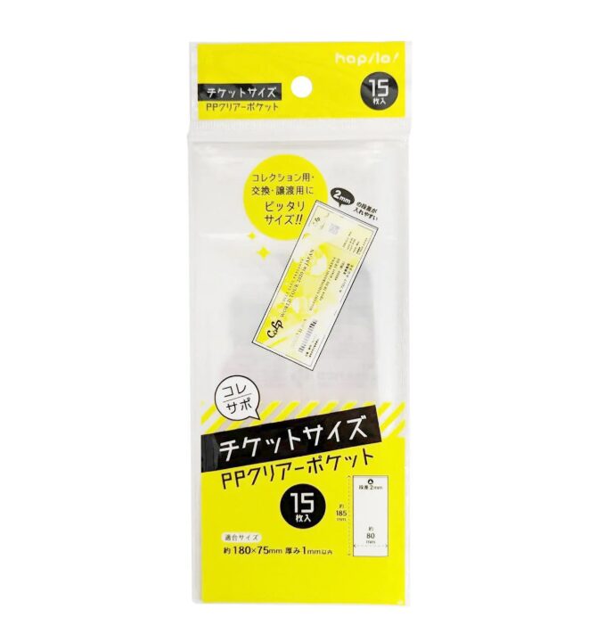 縦長デザインで紙チケットはもちろん、チェキ・ステッカーの一時保管にも◎。110円とは思えないクリア感と扱いやすさで、バッグにもスッと入るサイズ感がちょうど良いです。近年は店舗でも見かける機会が減っているため、見つけたら即買い推奨。ライブ参戦の記念をきれいに残したい人に心からおすすめできる優秀アイテムです。